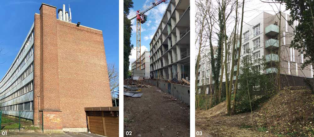 Construire sur la ville déjà là, c’est réfléchir à la réhabilitation d’immeubles constituant le patrimoine du XXe siècle en respectant leurs qualités originelles, ici l’ouverture sur le paysage de la résidence.