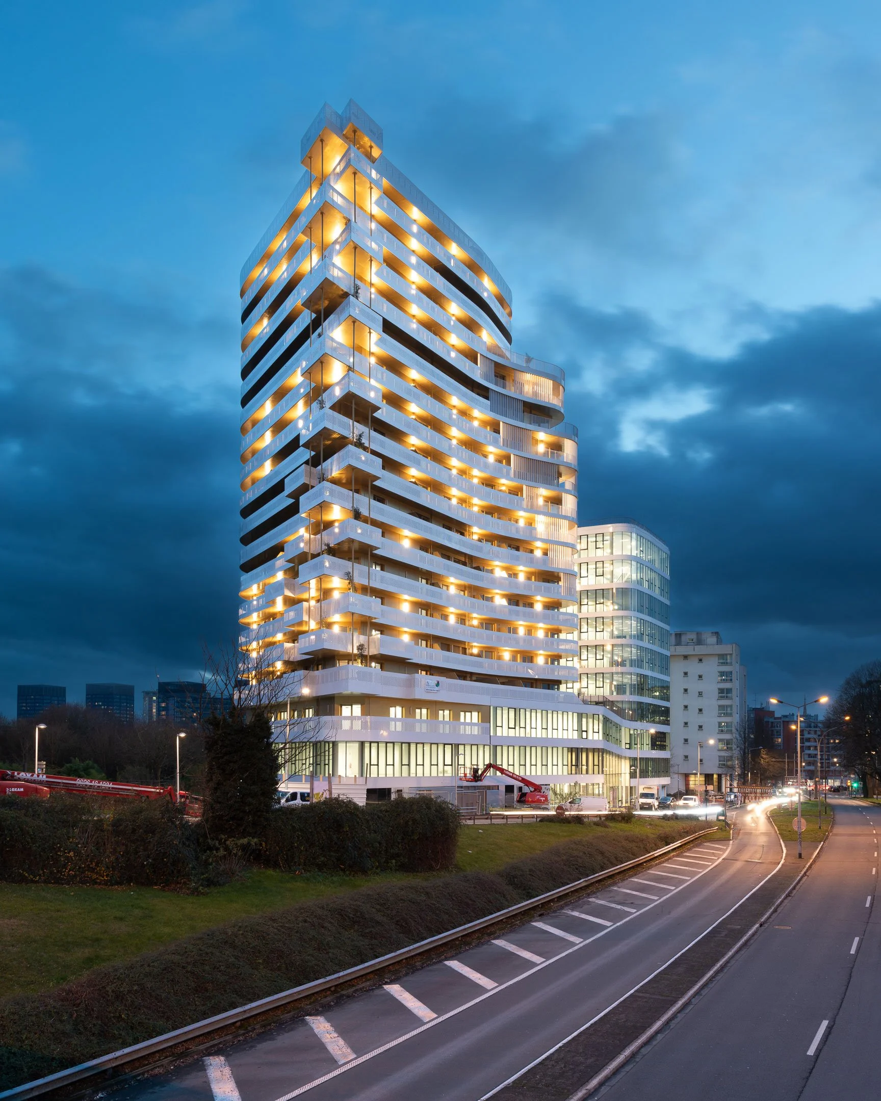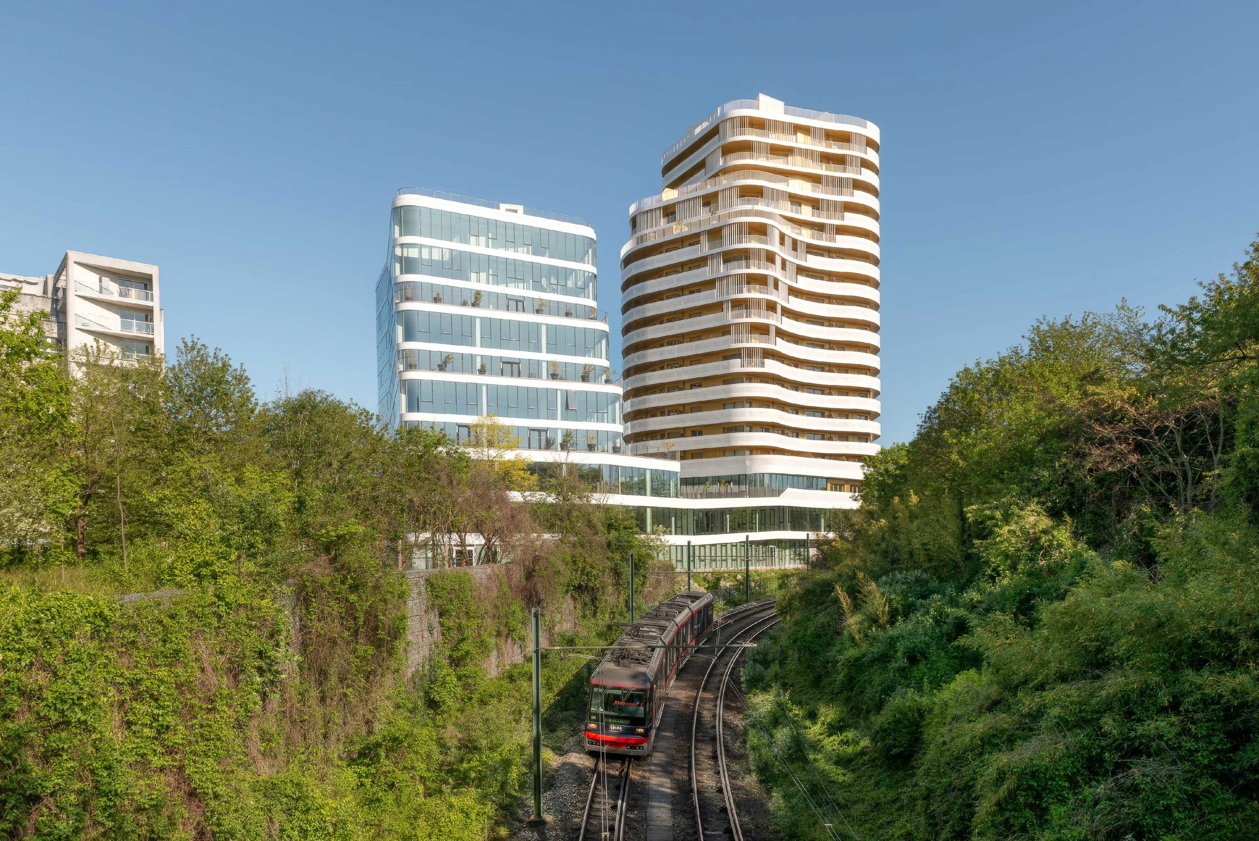 La tour de logements, desservie par un noyau central propose 100% de logements à double orientation. Grâce à leur épaisseur réduite, les bureaux sont baignés de lumière.