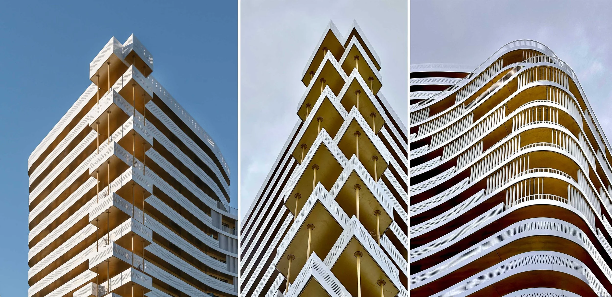 Jeu de courbes et de contrecourbes en réponse à l’environnement paysager du site, les façades sont traitées en verre, en aluminium laqué blanc et en béton lasuré de teinte dorée.