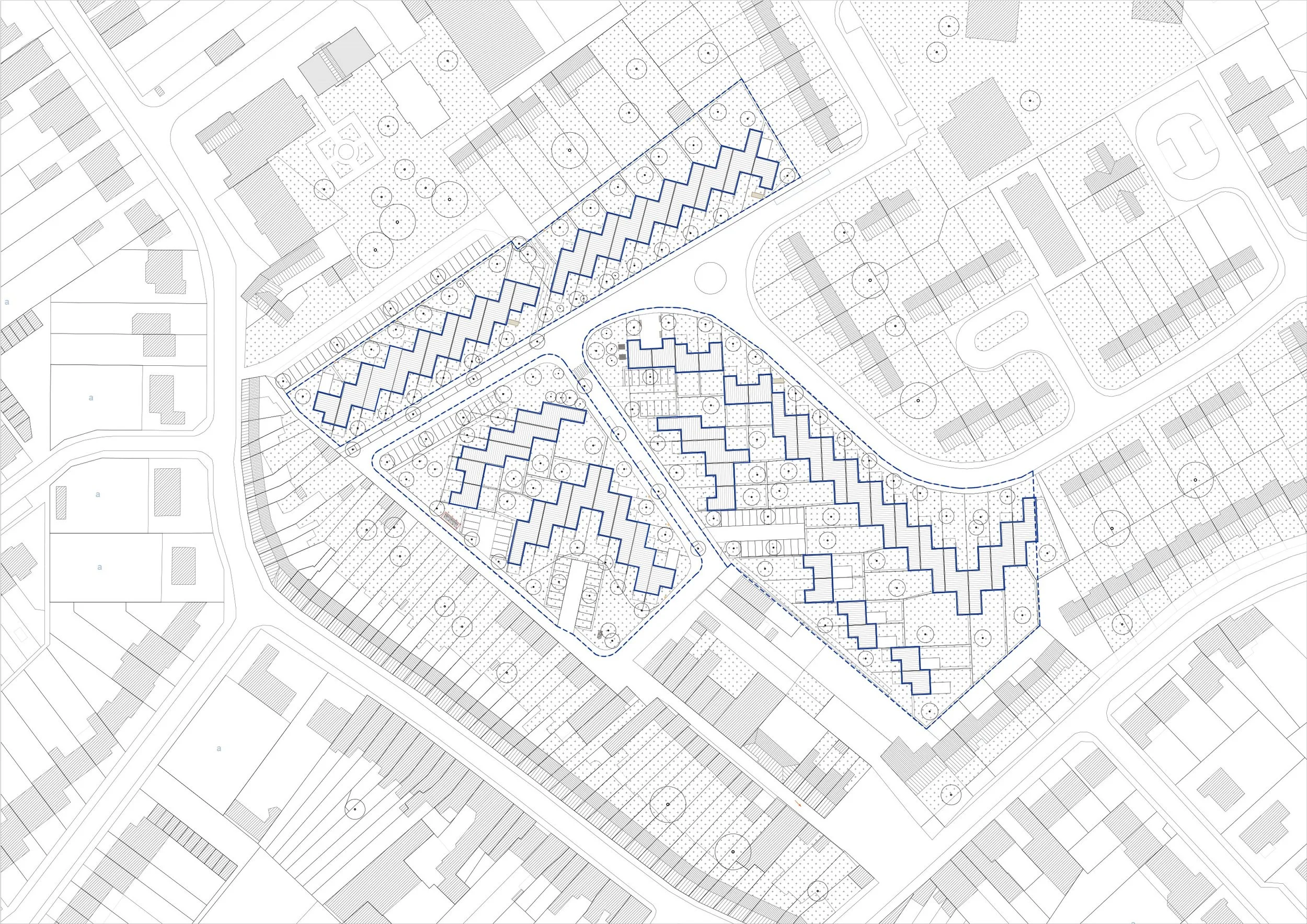 Le projet d’origine propose des bâtiments de logements individuels, collectifs et d’équipements autour de places, parcs, voies et venelles. Les maisons comprennent une imbrication de différents types de logements : T2 en « L », de T4 en « S » et de T6 en « S » surélevés d’un étage partiel, basés sur un module répétitif.